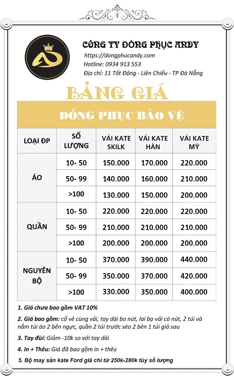 Gần 10 năm kinh nghiệm trong thị trường may mặc đồng phục tại Đà Nẵng, Andy là một cái tên được nhiều công ty bảo vệ lựa chọn để đặt may đồng phục cho nhân viên. Ngoài may đồng phục bảo vệ, xưởng còn nhận may các loại đồng phục phù hợp với tính chất nghề nghiệp khác nhau như: đồng phục bệnh viện, đồng phục bảo hộ lao động, đồng phục bệnh viện, đồng phục cafe, đồng phục học sinh, đồng phục bếp,đồng phục thể thao....