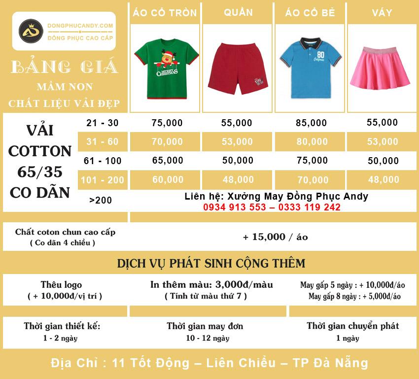 Bạn đang có nhu cầu đặt may đồng phục mầm non tại Đà Nẵng cho các bé nhưng chia biết đến địa chỉ nào hợp lý? Hãy đến ngay đồng phục Andy để được tư vấn thiết kế những mẫu đẹp nhất và chọn những loại vải chất lượng nhất.